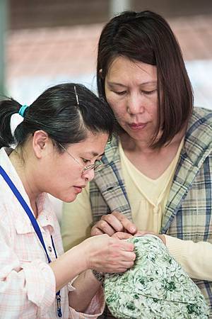 另一名右半邊中風者,少了慣用右手的協助,要車裁或縫製顯得更加困難。有時身體不平衡,一車就歪,令人洩氣。心疼的媽媽在一旁不時替她代勞,但是蔣湘苓仍不忘鼓舞這位學員,介紹她一些輔助器具,供她使用。言語中不時鼓勵她超越自己,強調:「不方便時學到的東西更加寶貴。」讓她有動力為自己多走一步路。