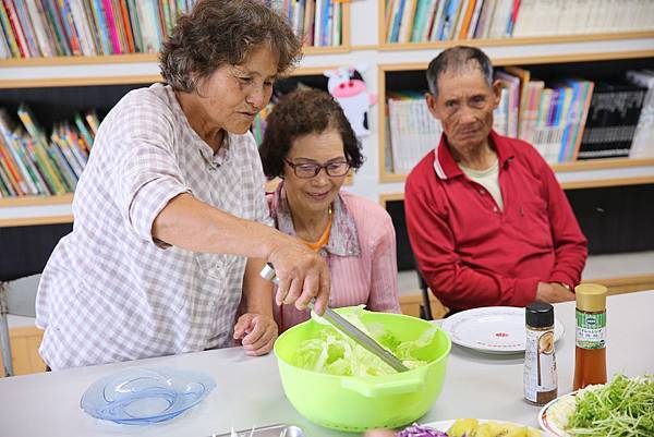 這一天,課堂上廚工備好材料,準備製作生菜沙拉。考量老人家的牙口不佳,特地將馬鈴薯、玉米事先煮過弄軟,並將各式有機蔬果切成細絲,以利入口。菜單上原本要調製甜柿千島醬,由於不是產季所以改成香蕉優格醬替代。廚工楊秀梅一邊講解一邊示範,將香蕉和優格放入果汁機打即刻完成醬汁,方便又美味。淋在生菜上香味撲鼻,老人家食用大讚好吃。看著他們吃得津津有味,一旁的老奶奶直說:「在家不會這樣弄,只有在這裡才吃得到。」
