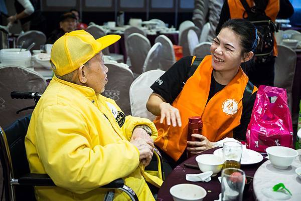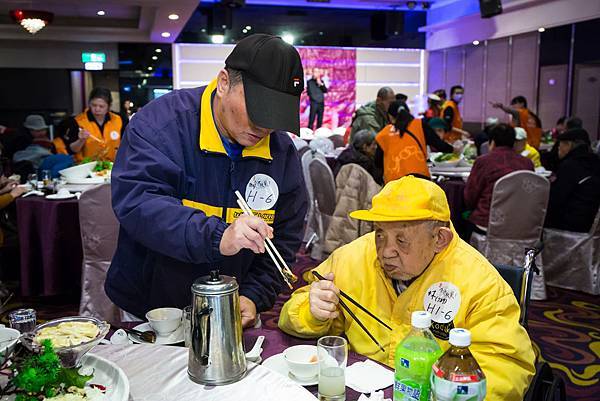 弱勢長輩、身障朋友難得出門齊聚一堂提前吃年夜飯,只見同工細心的在桌邊服務,幫忙盛湯、夾菜等,豐盛的佳餚令他們滿心感動。第一次參加圍爐的劉先生,平時過年和年邁父親簡單幾樣菜便打發,沒有機會享受大餐,他驚訝的說:「我以為是鐵皮屋搭建的流水席,沒想到是在大餐廳舉辦。」
