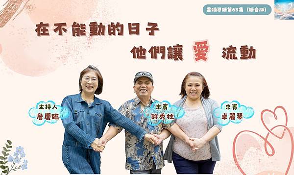 詹慶臨:很謝謝麗琴和阿柱接受訪問,也謝謝聽眾朋友收聽。從阿柱跟麗琴的分享中,我們不僅聽見了一段跨國相遇的奇妙旅程,而且也看見在苦難中堅持信心,同心同行的恩典見證。妻子麗琴以禱告來扶持先生阿柱,他們在主裡同行永不放棄,即使身體軟弱、困境來臨的時候,只要心中有盼望,信仰就能夠成為那不熄的燈火,我們以此互相勉勵。