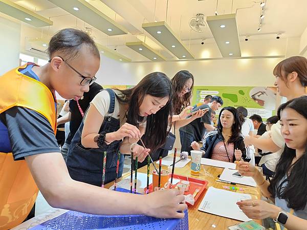 驕陽消融著韓國訪客精緻的妝容,踏入沁涼冷氣房的那一刻,來賓方從溽暑中得解脫。隨之迎來的是熱情的服務對象,他們親身擔任導覽員及分組手作的小老師。一面與參訪者實質接觸,另一面藉此促進服務對象的人際互動、訓練口語表達能力、提升自信心等。